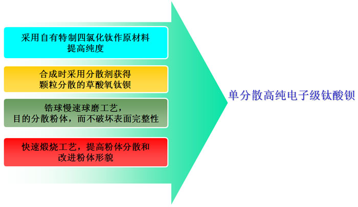 1、化学反应方程式: BaCl2+ 2H2C2O4+TiCl4=BaTiO(C2O4)2.4H2O BaTiO(C2O4)2.4H2O==BaTiO3+CO2+CO 2、钛酸钡粉末的制备方法有很多种,如水解法、溶胶—凝胶法、水热法和草酸盐沉淀法等等。 3、草酸盐沉淀法制备钛酸钡粉末由于具有反应条件温和,操作控制容易,设备投资少、易产业化、成本低等特点而得以广泛应用。 4、本公司钛酸钡工艺技术: